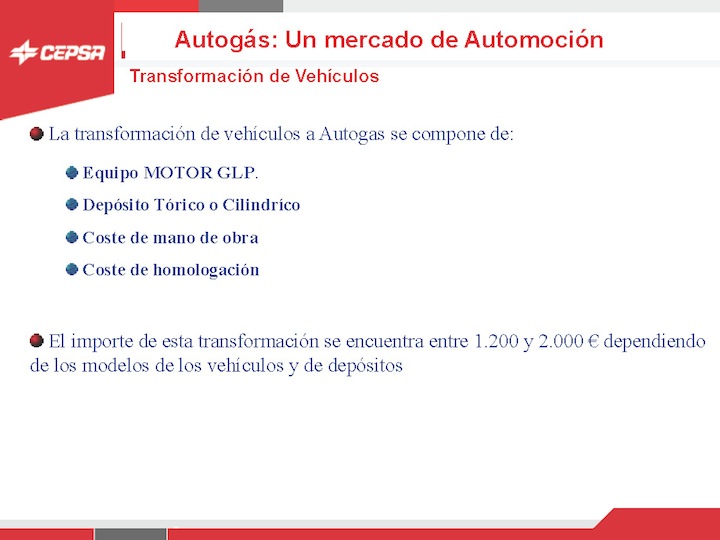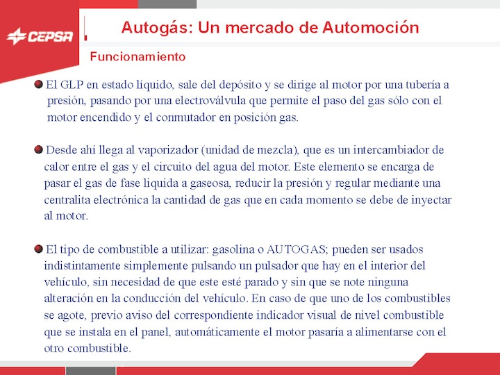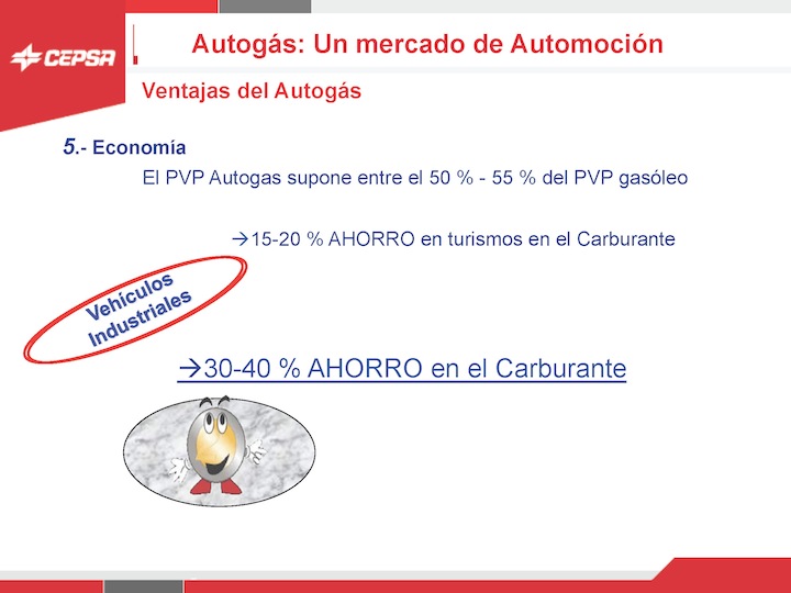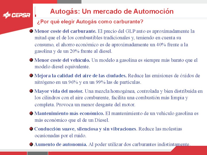 - Economía: Dado el bajo precio del autogás, el ahorro durante la explotación de un vehículo a GLP permite recuperar el sobre coste de inversión en unos plazos razonables (según el n.º de Km./año).