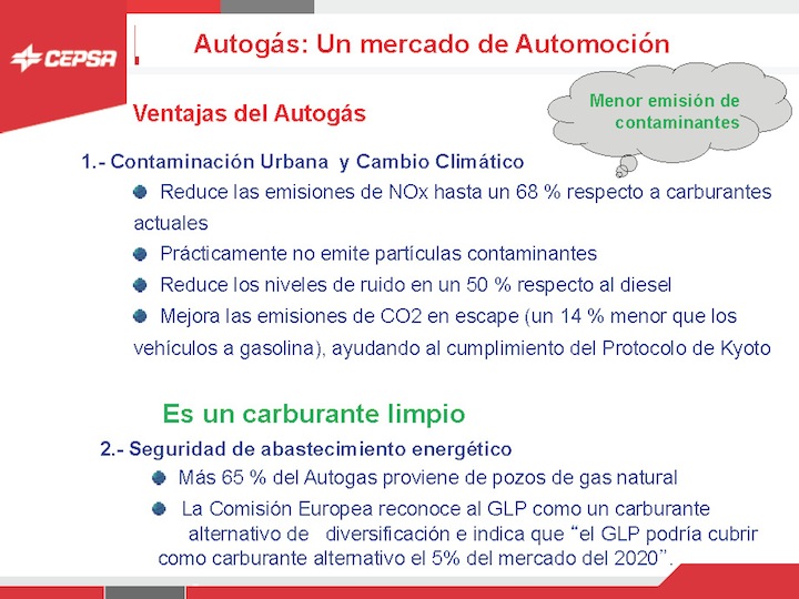 - Cambio Climático: Bajas emisiones de CO2 en escape (comparables a las de los vehículos diesel, y hasta un 10,9% menores que los de gasolina), ayudando al cumplimiento del Protocolo de Kyoto en el periodo 2008-2012.